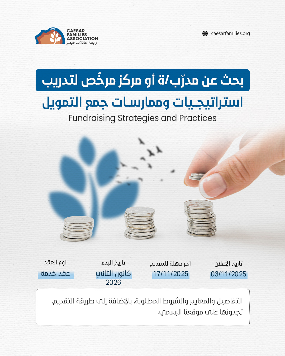 تعلن رابطة عائلات قيصر عن رغبتها في التعاون مع مدرب/ـة خبير/ـة أو مركز تدريب مرخّص لتقديم تدريب شامل عبر الإنترنت حول استراتيجيات وممارسات جمع التمويل (Fundraising Strategies and Practices)، يهدف إلى بناء قدرات فريق الرابطة في مجال تعبئة الموارد واستدامة التمويل.